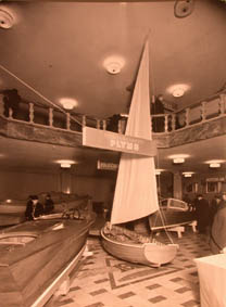 ![]() Utställning i Ostermans Marmorhallar i Stockholm City 1936. På bilden visas en Plymjolle. |