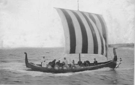![]() Drakskepp under segling. Byggdes till Olympiaden 1912. Detta drakskepp finns kvar än i dag och är i gott skick. Har idag namnet Viking Plym och seglas av Täby Vikingaskeppslag.